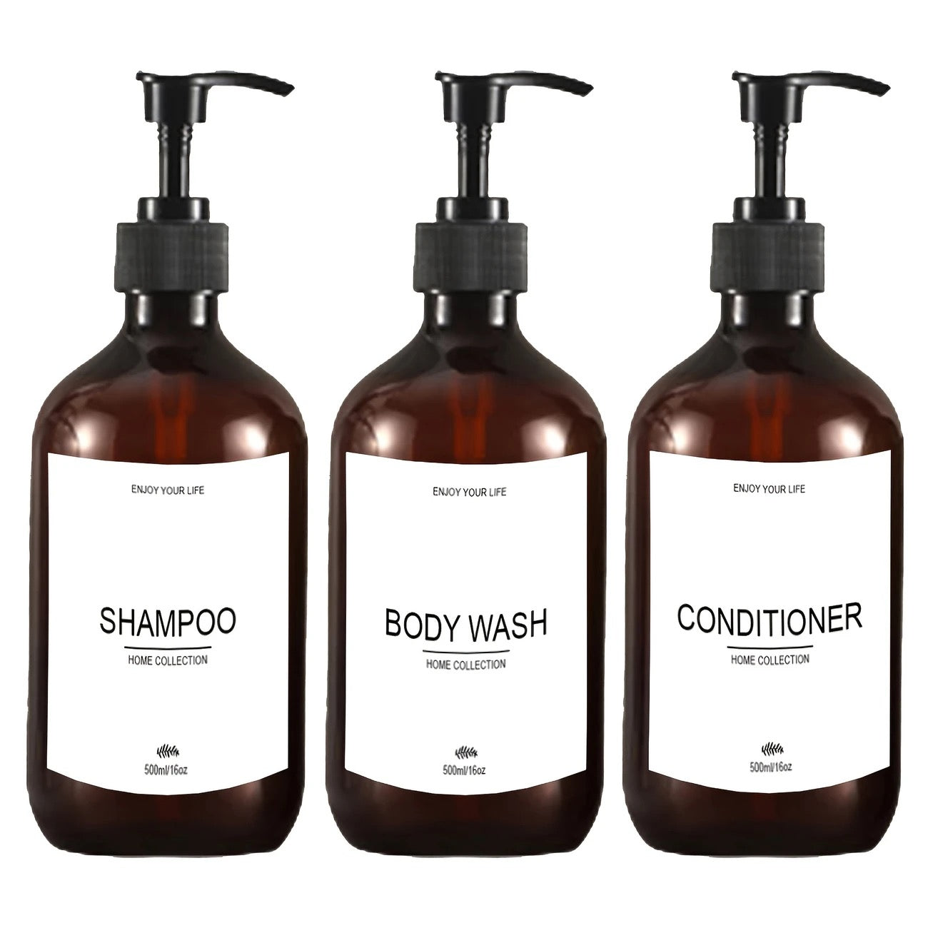 Bathroom Dispenser Containers with waterproof labels. Available in Black or Amber.